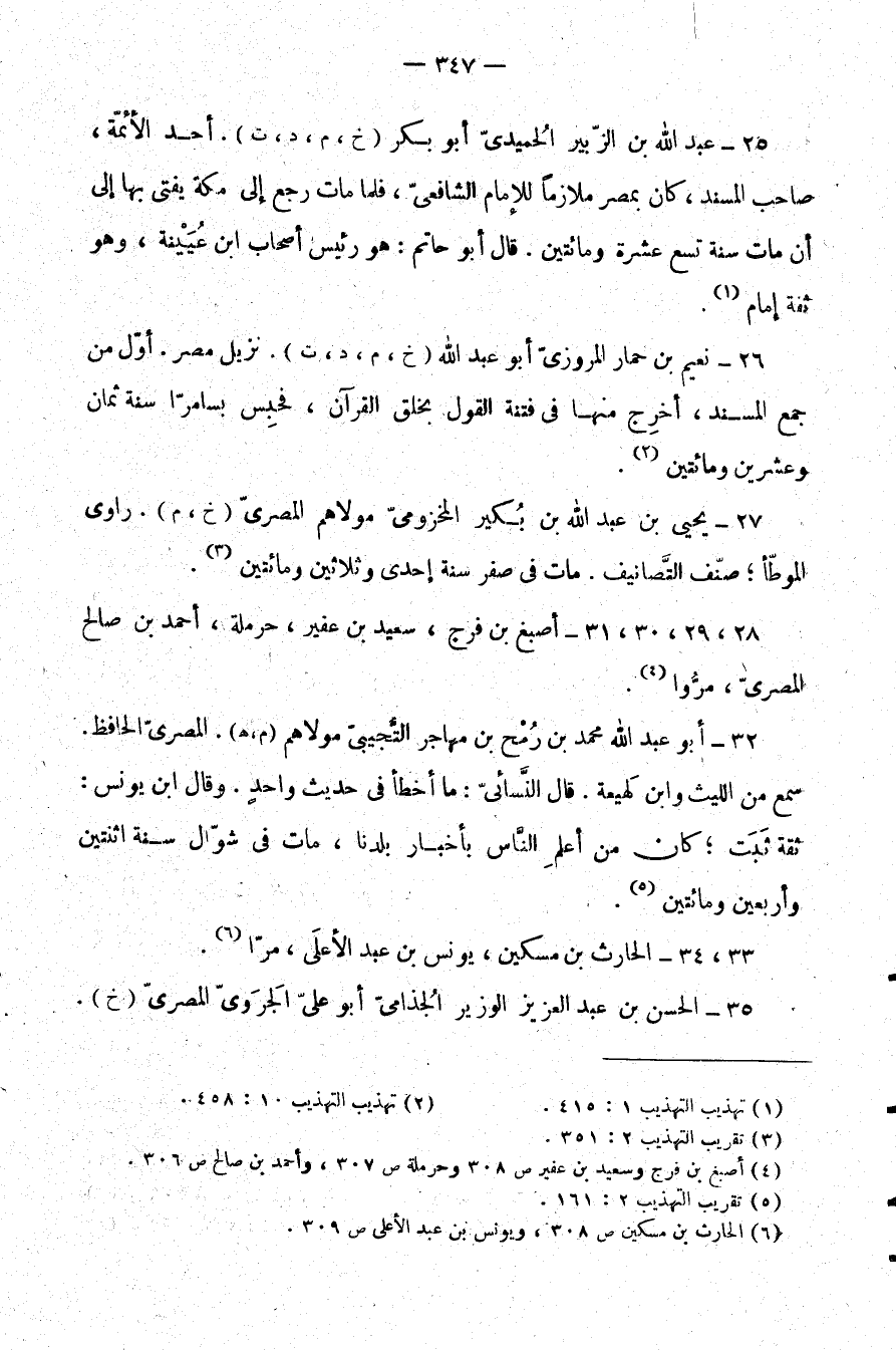 25- عبد الله بن الزبير الحميدي أبو بكر "خ، م، د، ت". أحد الأئمة، صاحب المسند، كان بمصر ملازمًا للإمام الشافعي، فلما مات رجع إلى مكة يفتي بها إلى أن مات سنة تسع عشرة ومائتين. قال أبو حاتم: هو رئيس أصحاب ابن عيينة، وهو ثقة إمام (¬1) .