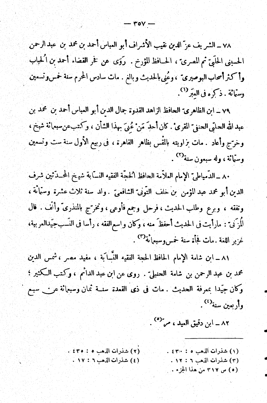 81- ابن شامة الإمام الحافظ الحجة الفقيه النسابة، مفيد مصر، شمس الدين محمد بن عبد الرحمن بن شامة الحنبلي. روى عن ابن عبد الدائم، وكتب الكثير؛ وكان جيدا بمعرفة الحديث. مات في ذي القعدة سنة ثمان وسبعمائة عن سبع وأربعين سنة (¬4) .