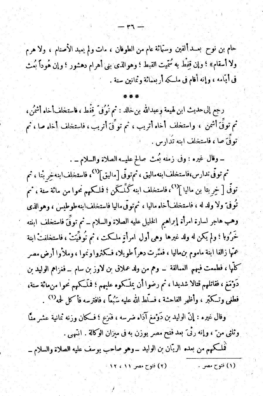 حام بن نوح بعد ألفين وستمائة عام من الطوفان، مات ولم يعبد الأصنام، ولا هرم ولا أسقام"؛ وإن قفط به سميت القبط؛ وهو الذي بنى أهرام دهشور؛ وإن هودا بعث في أيامه، وإنه أقام في ملكه أربعمائة وثمانين سنة.
