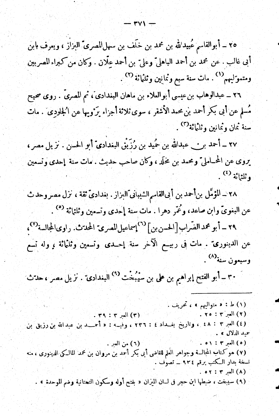 26- عبد الوهاب بن عيسى أبو العلاء ماهان البغدادي، ثم المصري. روى صحيح مسلم عن أبي بكر أحمد بن محمد الأشقر، سوى ثلاثة أجزاء يرويها عن الجُلودي. مات سنة ثمان وثمانين وثلاثمائة (¬3) .