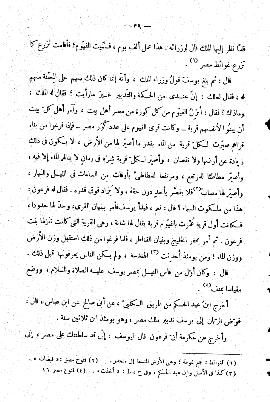 قال: ثم بلغ يوسف قول وزراء الملك، وأنه إنما كان ذلك منهم على المحنة منهم له، فقال للملك: إن عندي من الحكمة والتدبير غير ما رأيت؛ فقال الملك: وما ذاك؟ فقال: أنزل الفيوم من كل كورة من مصر أهل بيت، وآمر أهل كل بيت أن يبنوا لأنفسهم قرية -وكانت قرى الفيوم على عدد كور مصر- فإذا فرغوا من بناء قراهم صيرت لكل قرية من الماء بقدر ما أصير لها من الأرض، لا يكون في ذلك زيادة عن أرضها ولا نقصان، وأصير لكل قرية شربا في زمان لا ينالهم الماء إلا فيه، وأصير مطاطئا للمرتفع، ومرتفعا للمطاطئ بأوقات من الساعات في الليل والنهار، وأصير لها مصاب (¬2) فلا يقصر بأحد دون حقه، ولا يزداد فوق قدره. فقال له فرعون: هذا من ملكوت السماء؟ قال: نعم، فبدأ يوسف فأمر ببنيان القرى، وحد لها حدودا، فكانت أول قرية عمرت بالفيوم قرية يقال لها شانة، وهي القرية التي كانت تنزلها بنت فرعون. ثم أمر بحفر الخليج وبنيان القناطر، فلما فرغوا من ذلك استقبل الأرض ووزن الماء؛ ومن يومئذ أحدثت (¬3) الهندسة، ولم يكن الناس يعرفونها قبل ذلك.