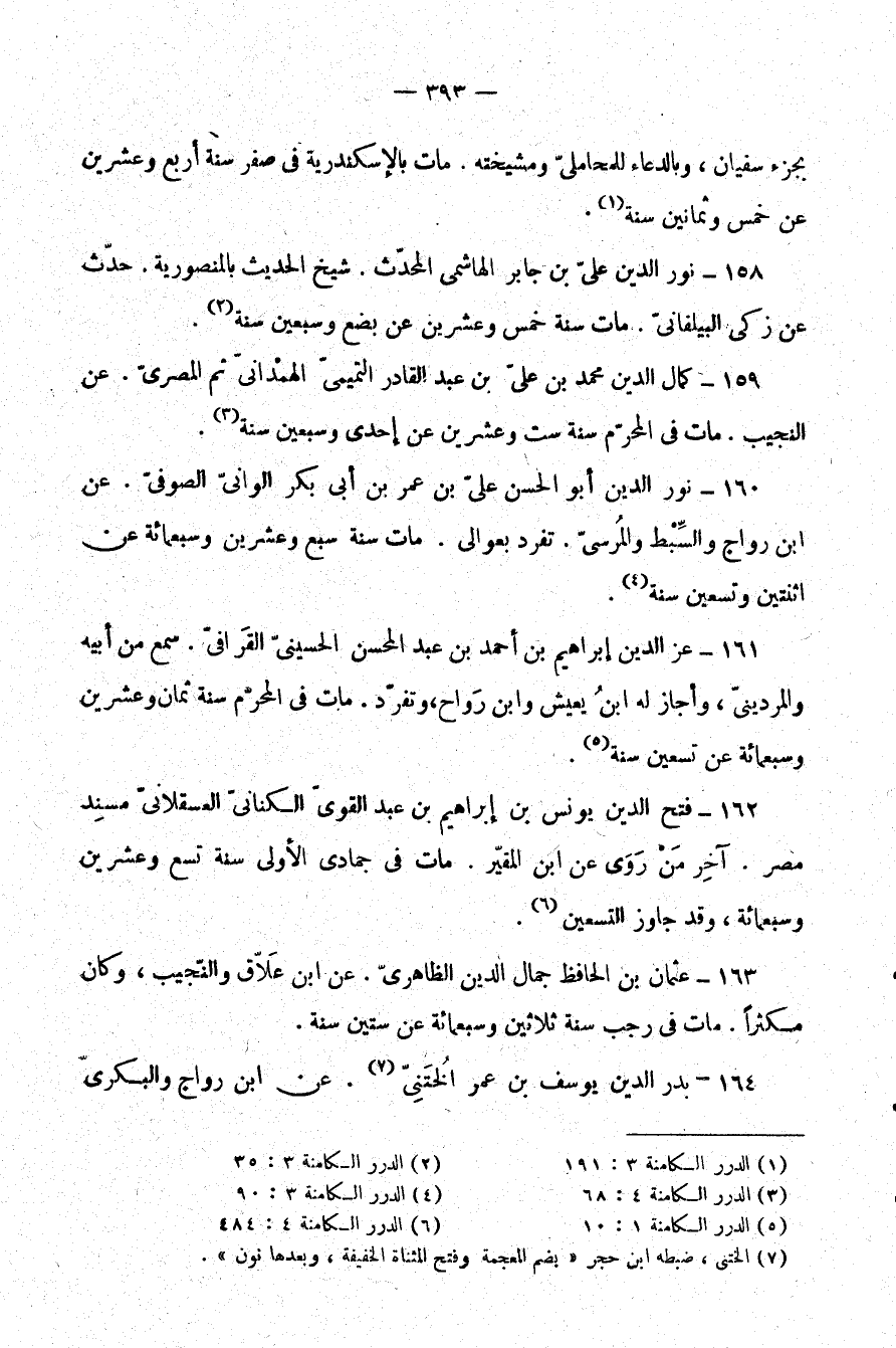158- نور الدين علي بن جابر الهاشمي المحدث. شيخ الحديث بالمنصورية. حدث عن زكي البيلقاني. مات سنة خمس وعشرين عن بضع وسبعين سنة (¬2) .