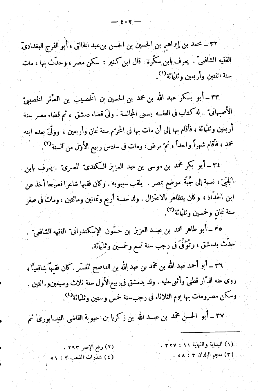 32- محمد بن إبراهيم بن الحسين بن الحسن بن عبد الخالق، أبو الفرج البغدادي الفقيه الشافعي. يُعرف بابن سكرة. قال ابن كثير: سكن مصر، وحدث بها، مات سنة اثنتين وأربعين وثلاثمائة (¬1) .