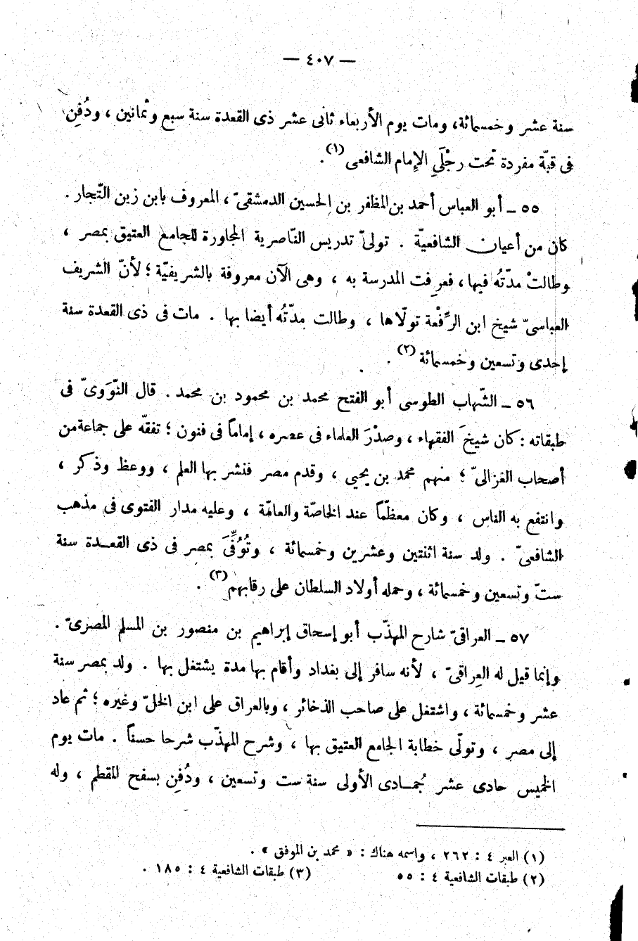 57- العراقي شارح المهذب أبو إسحاق بن منصور بن المسلم المصري. وإنما قيل له العراقي؛ لأنه سافر إلى بغداد وأقام بها مدة يشتغل بها. ولد بمصر سنة عشر وخمسمائة، واشتغل على صاحب الذخائر، وبالعراق على ابن الخل وغيره؛ ثم عاد إلى مصر، وتولى خطابة الجامع العتيق بها، وشرح المهذب شرحا حسنا. مات يوم الخميس حادي عشر جمادى الأولى سنة ست وتسعين، ودفن بسفح المقطم، وله