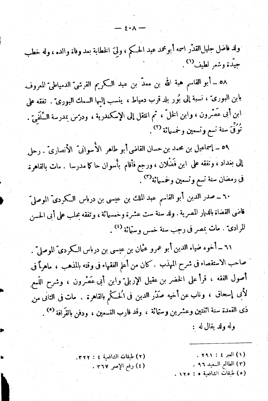 60- صدر الدين أبو القاسم عبد الملك بن عيسى بن درباس الكردي الموصلي قاضي القضاة بالديار المصرية. ولد سنة ست عشرة وخمسمائة، وتفقه بحلب على أبي الحسن المرادي. مات بمصر في رجب سنة خمس وستمائة (¬4) .