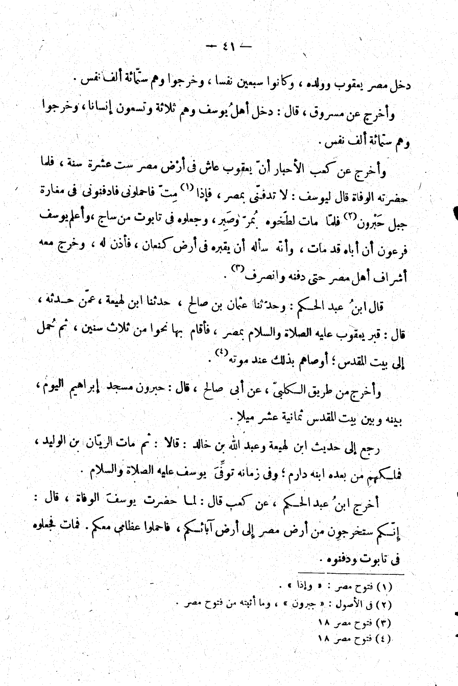 قال ابن عبد الحكم: وحدثنا عثمان بن صالح، حدثنا ابن لهيعة، عمن حدثه، قال: قبر يعقوب عليه الصلاة والسلام بمصر، فأقام بها نحوا من ثلاث سنين، ثم حمل إلى بيت المقدس؛ أوصاهم بذلك عند موته (¬4) .