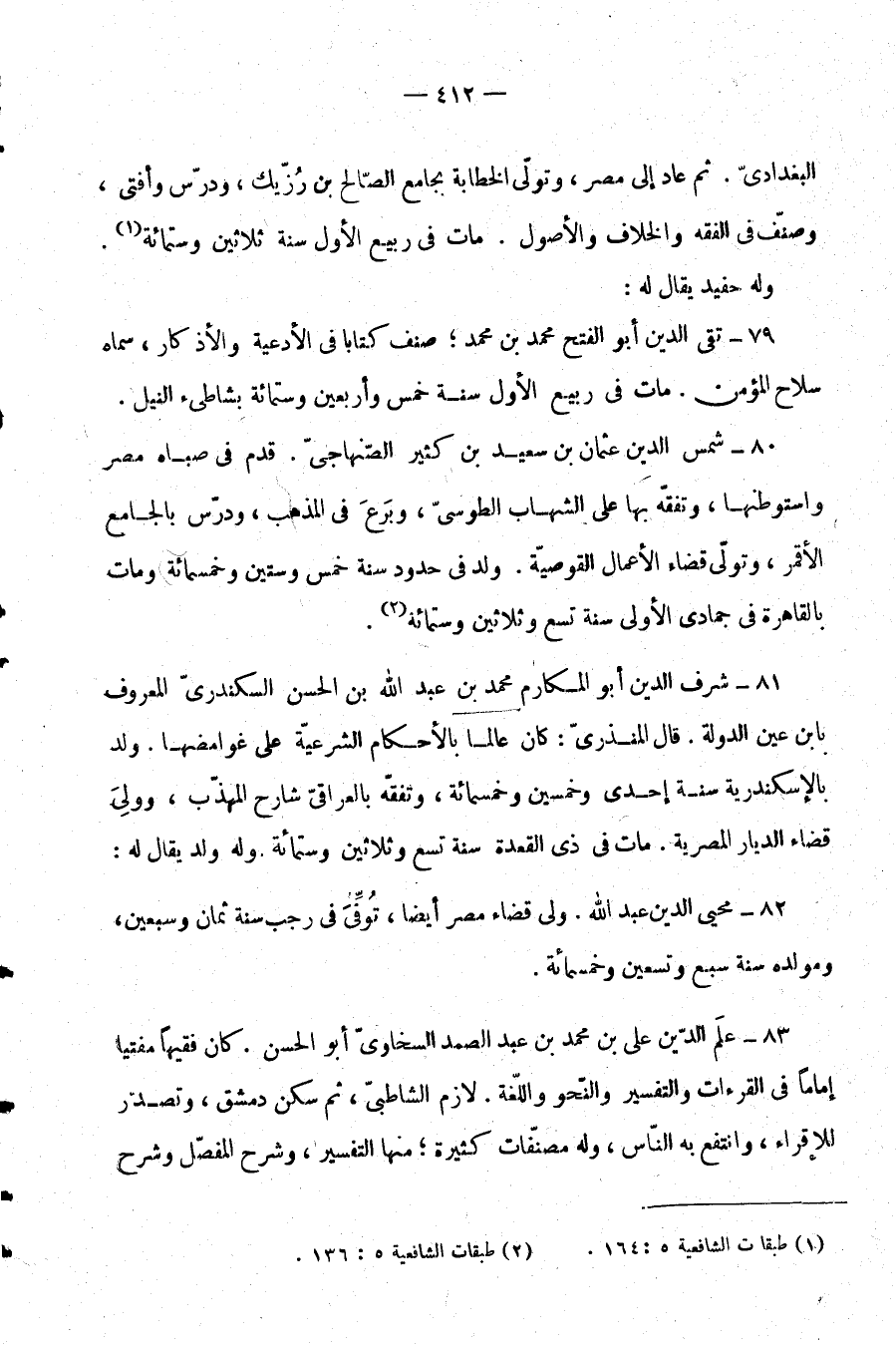 80- شمس الدين عثمان بن سعيد بن كثير الصنهاجي. قدم في صباه مصر واستوطنها، وتفقه بها على الشهاب الطوسي، وبرع في المذهب، ودرس بالجامع الأقمر، وتولى قضاء الأعمال القوصية. ولد في حدود سنة خمس وستين وخمسمائة ومات بالقاهرة في جمادى الأولى سنة تسع وثلاثين وستمائة (¬2) .