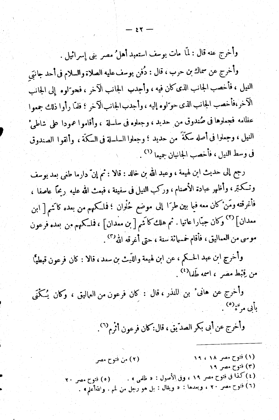 رجع إلى حديث ابن لهيعة، وعبد الله بن خالد: قالا: ثم إن دارما طغى بعد يوسف وتكبر، وأظهر عبادة الأصنام، وركب النيل في سفينة، فبعث الله عليه ريحًا عاصفًا، فأغرقته ومن كان معه فيما بين طرا إلى موضع حلوان؛ فملكهم من بعده كاشم "بن معدان" (¬2) وكان جبارًا عاتيا. ثم هلك كاشم "بن معدان"، فملكهم من بعده فرعون موسى من العماليق، فأقام خمسمائة سنة، حتى أغرقه الله (¬3) .