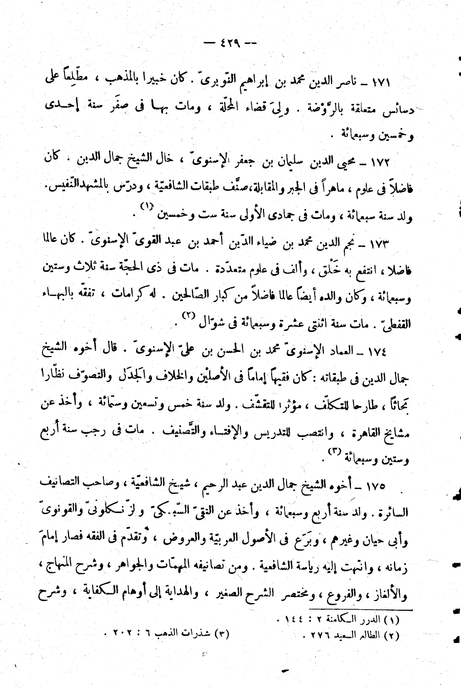 175- أخوه الشيخ جمال الدين عبد الرحيم، شيخ الشافعية، وصاحب التصانيف السائرة. ولد سنة أربع وسبعمائة، وأخذ عن التقي السبكي والزنكلوني والقونوي وأبي حيان وغيرهم، وبرع في الأصول العربية والعروض، وتقدم في الفقه فصار إمام زمانه، وانتهت إليه رياسة الشافعية. ومن تصانيفه المهمات والجواهر، وشرح المنهاج والألغاز، والفروع، ومختصر الشرح الصغير، والهداية إلى أوهام الكفاية، وشرح