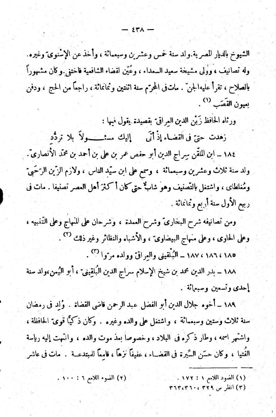 184- ابن الملقن سراج الدين أبو حفص عمر بن علي بن أحمد بن محمد الأنصاري. ولد سنة ثلاث وعشرين وسبعمائة، وسمع على ابن سيد الناس، ولازم الزين الرحبي ومغلطاي، واشتغل بالتصنيف وهو شاب حتى كان أكثر أهل العصر تصنيفًا. مات في ربيع الأول سنة أربع وثمانمائة.