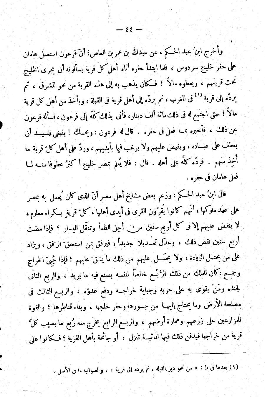 قال ابن عبد الحكم: وزعم بعض مشايخ أهل مصر أن الذي كان يُعمل به بمصر على عهد ملوكها، أنهم كانوا يُقرون القرى في أيدي أهلها، كل قرية بكراء معلوم، لا ينقض عليهم إلا في كل أربع سنين من أجل الظمأ وتنقل اليسار؛ فإذا مضت أربع سنين نقض ذلك، وعدل تعديلًا جديدًا، فيرفق بمن استحق الرفق،