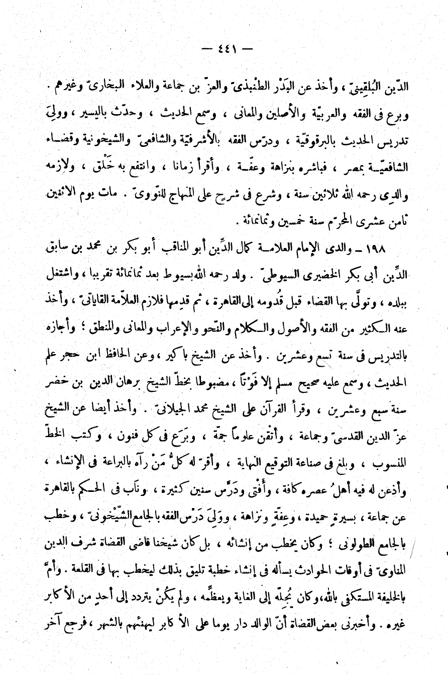 198- والدي الإمام العلامة كمال الدين أبو المناقب أبو بكر بن محمد بن سابق الدين أبي بكر الخضيري السيوطي. ولد رحمه الله بسيوط بعد ثمانمائة تقريبًا، واشتغل ببلده، وتولى بها القضاء قبل قدومه إلى القاهرة، ثم قدمها فلازم العلامة القاياتي، وأخذ عنه الكثير من الفقه والأصول والكلام والنحو والإعراب والمعاني والمنطق؛ وأجازه بالتدريس في سنة تسع وعشرين. وأخذ عن الشيخ باكير، وعن الحافظ ابن حجر علم الحديث، وسمع عليه صحيح مسلم إلا فوتًا، مضبوطًا بخط الشيخ برهان الدين بن خضر سنة سبع وعشرين، وقرأ القرآن على الشيخ محمد الجيلاني. وأخذ أيضًا عن الشيخ عز الدين القدسي وجماعة، وأتقن علومًا جمة، وبرع في كل فنون، وكتب الخط المنسوب، وبلغ في صناعة التوقيع النهاية، وأقر له كل من رآه بالبراعة في الإنشاء، وأذعن له فيه أهل عصره كافة، وأفتى ودرس سنين كثيرة، وناب في الحكم بالقاهرة عن جماعة، بسيرة حميدة، وعفة ونزاهة، وولي درس الفقه بالجامع الشيخوني، وخطب بالجامع الطولوني؛ وكان يخطب من إنشائه خطبة، بل كان شيخ قاضي القضاة شرف الدين المناوي في أوقات الحوادث يسأله في إنشاء خطبة تليق بذلك ليخطب بها في القلعة. وأمَّ بالخليفة المستكفي بالله، وكان يجله إلى الغاية ويعظمه، ولم يكن يتردد إلى أحد من الأكابر غيره. وأخبرني بعض القضاة أن الوالد دار يومًا على الأكابر ليهنئهم بالشهر، فرجع آخر