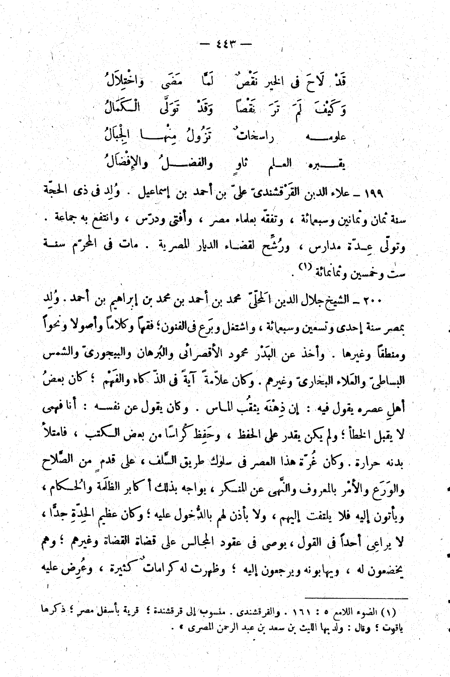 (¬1) الضوء اللامع 5: 161. والقرقشندي. منسوب إلى قرقشندة؛ قرية بأسفل مصر؛ ذكرها ياقوت؛ وقال: "ولد بها الليث بن سعد بن عبد الرحمن".