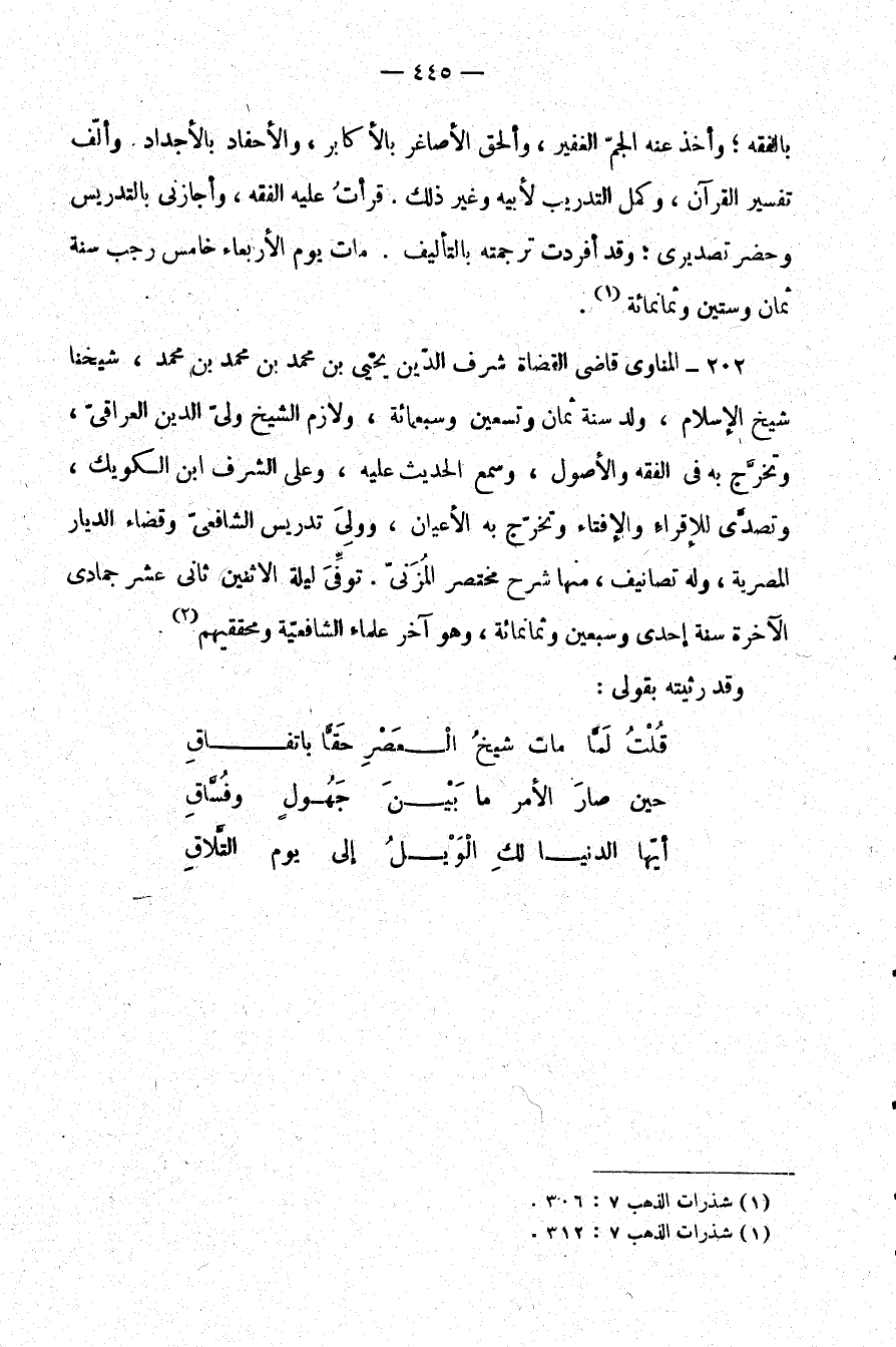 202- المناوي قاضي القضاة شرف الدين يحيى بن محمد بن محمد بن محمد، شيخنا شيخ الإسلام، ولد سنة ثمان وتسعين وسبعمائة، ولازم الشيخ ولي الدين العراقي، وتخرج به في الفقه والأصول، وسمع الحديث عليه، وعلى الشرف ابن الكويك، وتصدى للإقراء والإفتاء وتخرج به الأعيان، وولي تدريس الشافعي وقضاء الديار المصري، وله تصانيف، منها شرح مختصر المزني. توفي ليلة الاثنين ثاني عشر جمادى الآخرة سنة إحدى وسبعين وثمانمائة، وهو آخر علماء الشافعية ومحققيهم (¬2) .