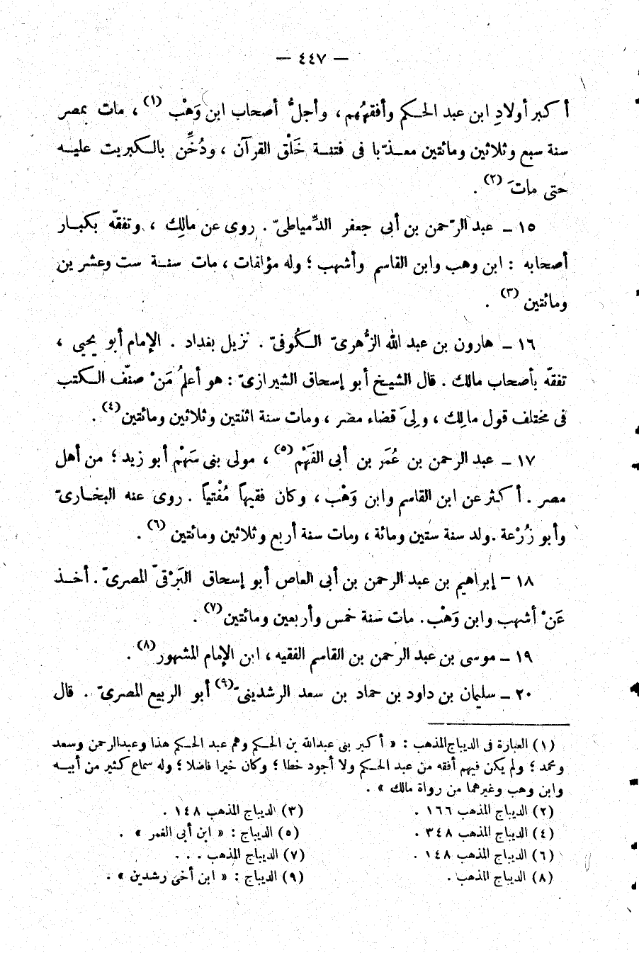 (¬1) العبارة في الديباج المذهب: "أكبر بني عبد الله بن الحكم وهم عبد الحكم هذا وعبد الرحمن وسعد ومحمد؛ ولم يكن فيهم أفقه من عبد الحكم ولا أجود خطًّا؛ وكان خيرًا فاضلًا؛ وله سماع كثير من أبيه وابن وهب وغيرهما من رواة مالك".