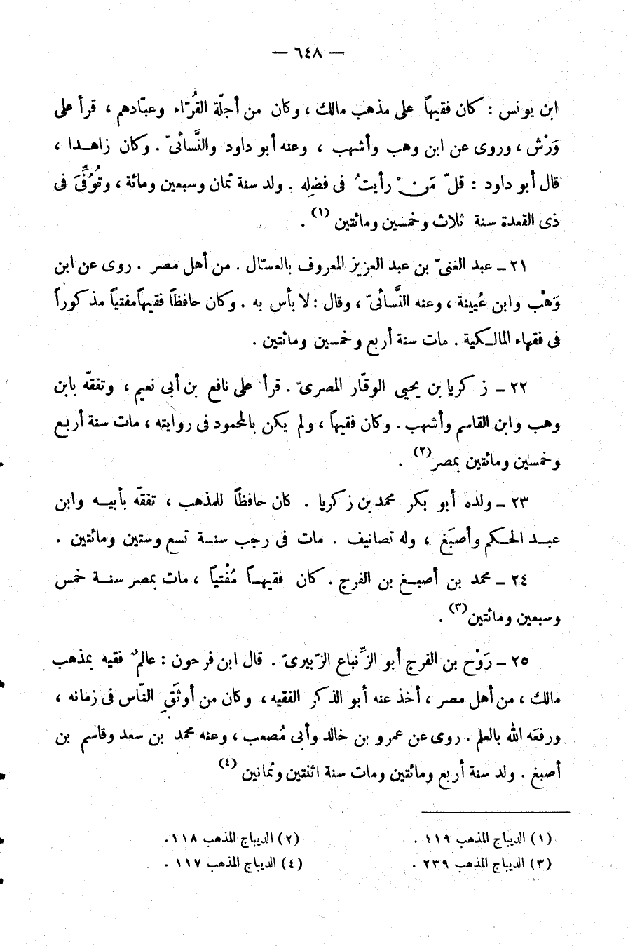 22- زكريا بن يحيى الوقار المصري. قرأ على نافع بن أبي نعيم، وتفقه بابن وهب وابن القاسم وأشهب. وكان فقيهًا، ولم يكن بالمحمود في روايته، مات سنة أربع وخمسين ومائتين بمصر (¬2) .
