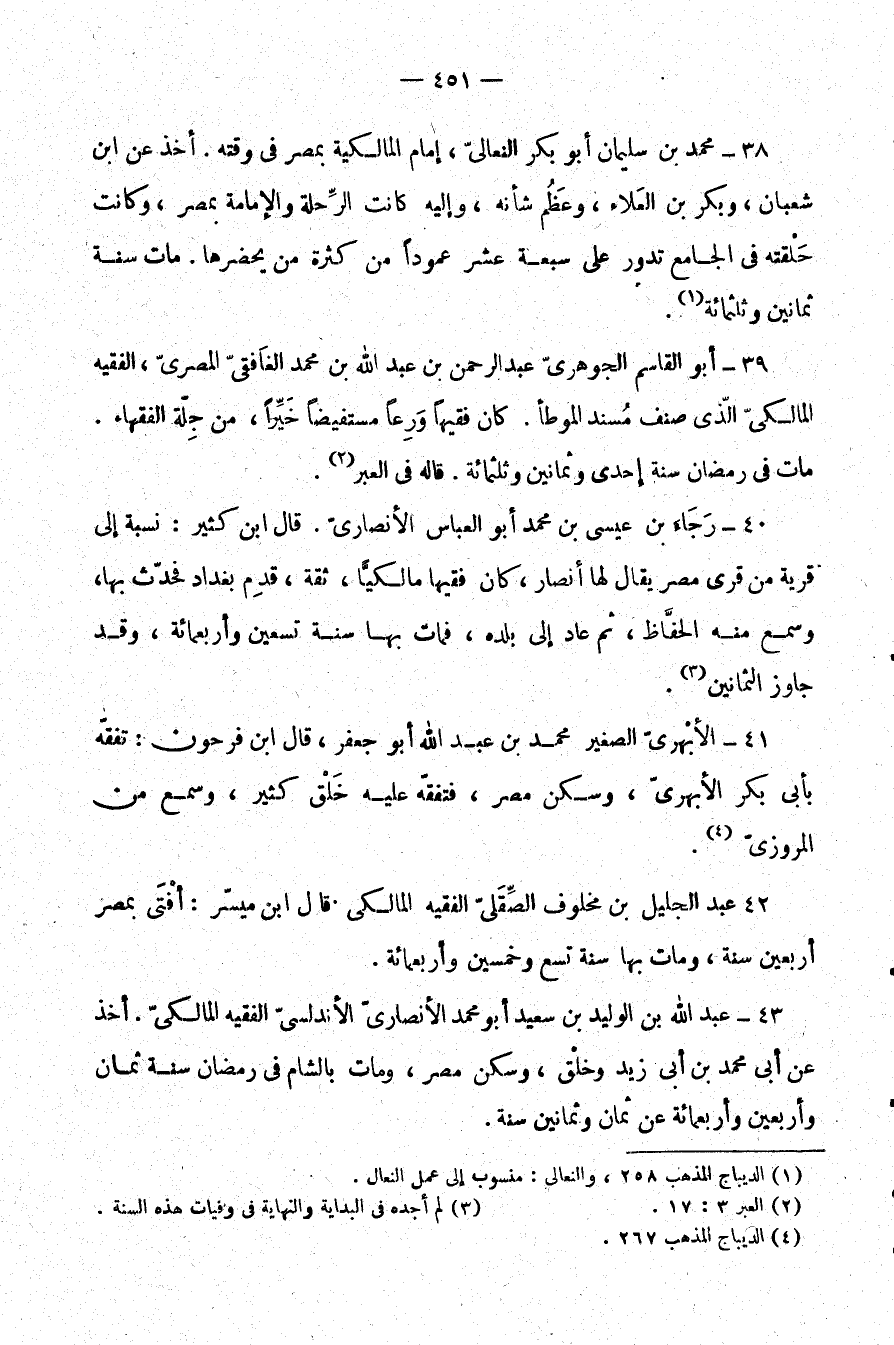 38- محمد بن سليمان أبو بكر النعالي، إمام المالكية بمصر في وقته. أخذ عن ابن شعبان، وبكر بن العلاء، وعظم شأنه، وإليه كانت الرحلة والإمامة بمصر، وكانت حلقته في الجامع تدور على سبعة عشر عمودًا من كثرة من يحضرها. مات سنة ثمانين وثلاثمائة (¬1) .