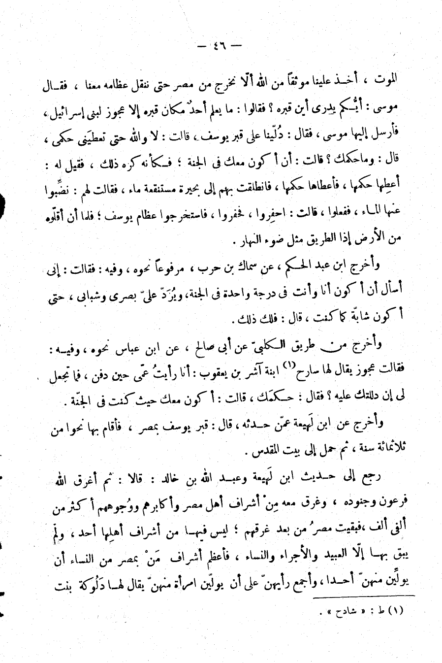 الموت، أخذ علينا موثقًا من الله ألا نخرج من مصر حتى ننقل عظامه معنا، فقال موسى: أيكم يدري أين قبره. فقالوا: ما يعلم أحد مكان قبره إلا عجوز لبني إسرائيل، فأرسل إليها موسى، فقال: دلينا على قبر يوسف، قالت: لا والله حتى تعطيني حكمي، قال: وما حكمك؟ قالت: أن أكون معك في الجنة؛ فكأنه كره ذلك، فقيل له: أعطها حكمها، فأعطاها حكمها، فانطلقت بهم إلى بحيرة مستنقعة ماء، فقالت لهم: نضِّبوا عنها الماء، ففعلوا، قالت: احفروا، فحفروا، فاستخرجوا عظام يوسف؛ فلما أن أقلوه من الأرض إذا الطريق مثل ضوء النهار".