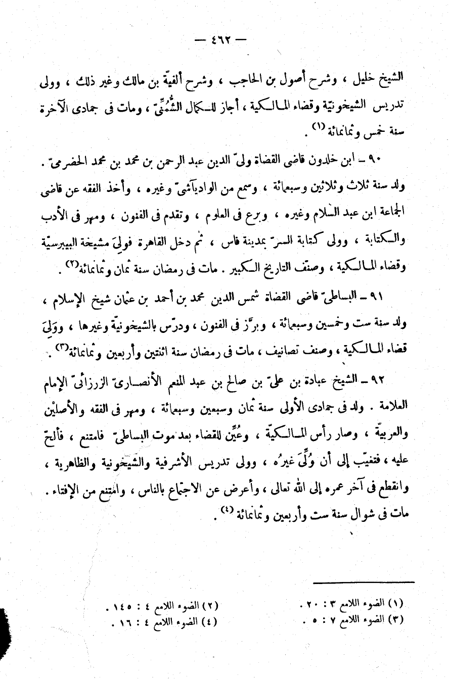 90- ابن خلدون قاضي القضاة ولي الدين عبد الرحمن بن محمد بن محمد الحضرمي. ولد سنة ثلاث وثلاثين وسبعمائة، وسمع من الواد بآشي وغيره، وأخذ الفقه عن قاضي الجماعة ابن عبد السلام وغيره، وبرع في العلوم، وتقدم في الفنون، ومهر في الأدب والكتابة، وولي كتابة السر بمدينة فاس، ثم دخل القاهرة فولي مشيخة البيبرسية وقضاء المالكية، وصنف التاريخ الكبير. مات في رمضان سنة ثمان وثمانمائة (¬2) .