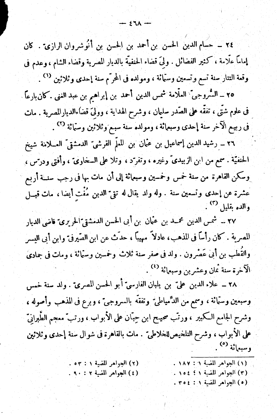 24- حسام الدين الحسن بن أحمد بن الحسن بن أنوشروان الرازي. كان إمامًا علامة، كثير الفضائل. ولي قضاء الحنفية بالديار المصرية وقضاء الشام، وعدم في وقعة التتار سنة تسع وتسعين وستمائة، ومولده في المحرم سنة إحدى وثلاثين (¬1) .