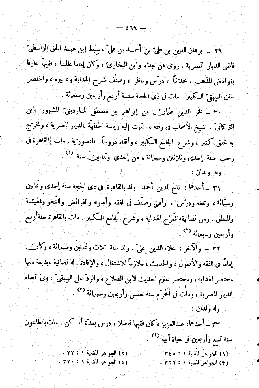 30- فخر الدين عثمان بن إبراهيم بن مصطفى المارديني المشهور بابن التركماني. شيخ الأصحاب في وقته، انتهت إليه رياسة الحنفية بالديار المصرية، وتخرج به خلق كثير، وشرح الجامع الكبير، وألقاه دروسًا بالمنصورية. مات بالقاهرة في رجب سنة إحدى وثلاثين وسبعمائة، عن إحدى وثمانين سنة (¬1) .
