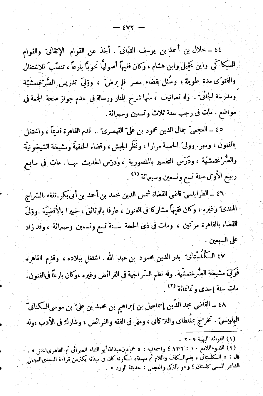47- الكلستاني بدر الدين محمود بن عبد الله. اشتغل ببلاده، وقدم القاهرة فولي مشيخة الصُّرغتمشية. وله نظم السراجية في الفرائض وغيره، وكان بارعًا في الفنون. مات سنة إحدى وثمانمائة (¬2) .