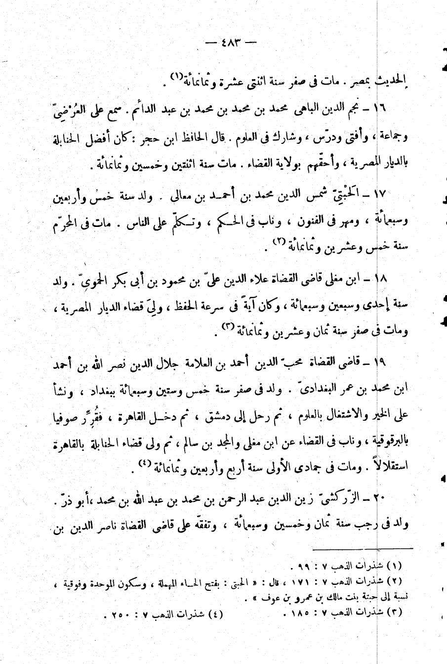 16- نجم الدين الباهي محمد بن محمد بن محمد بن عبد الدائم. سمع على العرضي وجماعة، وأفتى ودرس، وشارك في العلوم. قال الحافظ ابن حجر: كان أفضل الحنابلة بالديار المصرية، وأحقهم بولاية القضاء. مات سنة اثنتين وخمسين وثمانمائة.