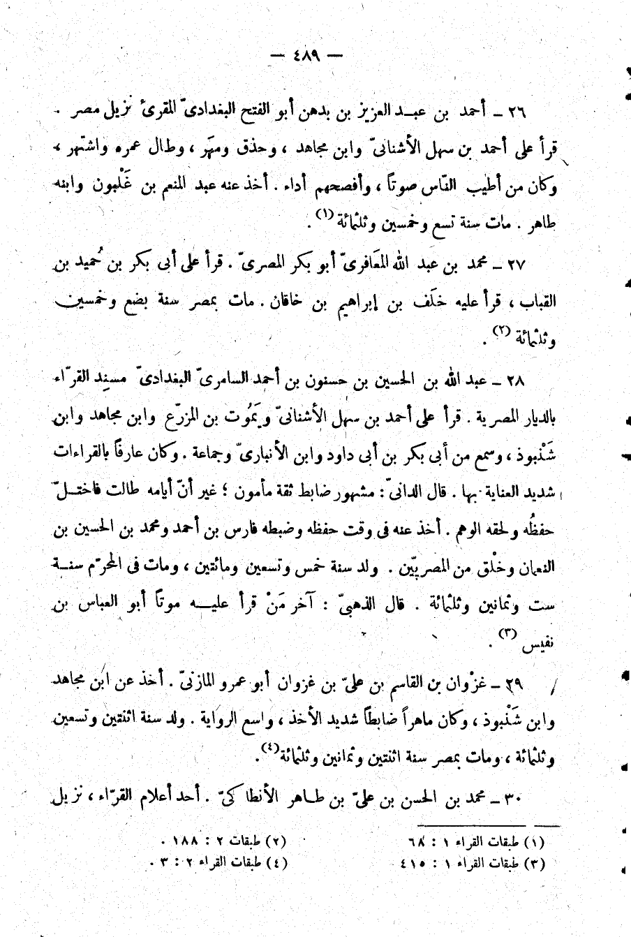 28- عبد الله بن الحسين بن حسنون بن أحمد السامري البغدادي مسند القراء بالديار المصرية. قرأ على أحمد بن سهل الأشناني ويموت بن المزرع وابن مجاهد وابن شنبوذ، وسمع من أبي بكر بن أبي داود وابن الأنباري وجماعة.