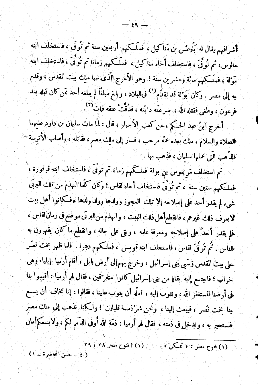 أشرافهم يقال له بلوطس بن مناكيل، فملكهم أربعين سنة ثم توفي، فاستخلف ابنه مالوس، ثم توفي، فاستخلف أخاه مناكيل فملكهم زمانا ثم توفي، فاستخلف ابنه بولة، فملكهم مائة وعشرين سنة؛ وهو الأعرج الذي سبا ملك بيت المقدس، وقدم به إلى مصر. وكان بولة قد تقدم (¬1) في البلاد، وبلغ مبلغا لم يبلغه أحد ممن كان قبله بعد فرعون، وطغى فقتله الله، صرعته دابته، فدقت عنقه فمات (¬2) .