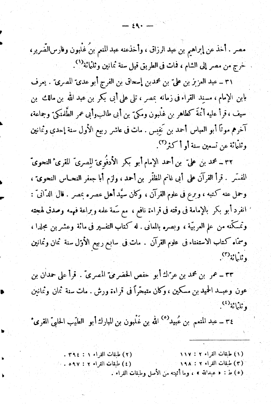 31- عبد العزيز بن علي بن محمد بن إسحاق بن الفرج أبو عدي المصري. يعرف بابن الإمام، مسند القراء في زمانه بمصر، تلى على أبي بكر بن عبد الله بن مالك بن سيف، قرأ عليه أئمة كطاهر بن غلبون ومكي بن أبي طالب وأبي عمر الطلمنكي وجماعة، آخرهم موتًا أبو العباس أحمد بن نفيس. مات في عاشر ربيع الأول سنة إحدى وثمانين وثلاثمائة عن تسعين سنة أو أكثر (¬2) .