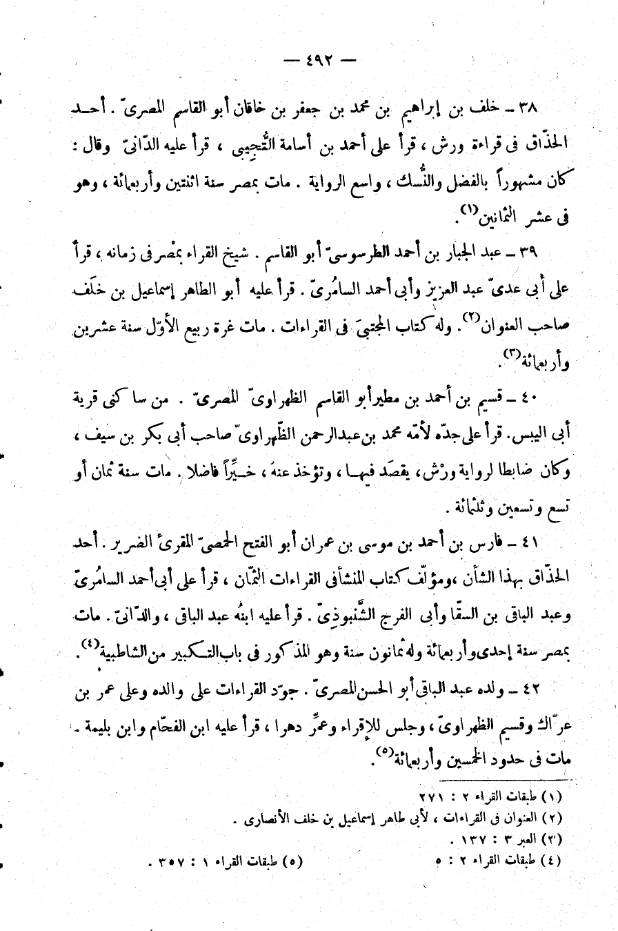 39- عبد الجبار بن أحمد الطرسوسي أبو القاسم. شيخ القراءة بمصر في زمانه، قرأ على أبي عدي عبد العزيز وأبي أحمد السامري. قرأ عليه الطاهر إسماعيل بن خلف صاحب العنوان (¬2) . وله كتاب المجتبى في القراءات. مات غرة ربيع الأول سنة عشرين وأربعمائة (¬3) .