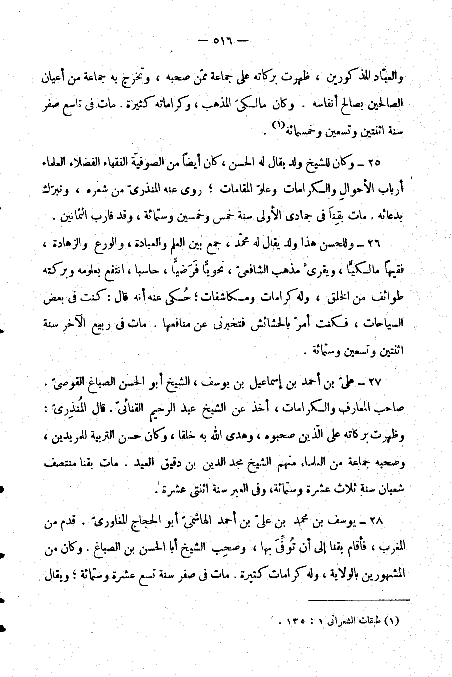 26- وللحسن هذا ولد يقال له محمد، جمع بين العلم والعبادة، والورع والزهادة، فقيها مالكيا، ويقرئ مذهب الشافعي، نحويا فرضيا، حاسبا، انتفع بعلومه وبركته طوائف من الخلق، وله كرامات ومكاشفات؛ حُكي عنه أنه قال: كنت في بعض السياحات، فكنت أمر بالحشائس فتخبرني من منافعها. مات في ربيع الآخر سنة اثنتين وتسعين وستمائة.
