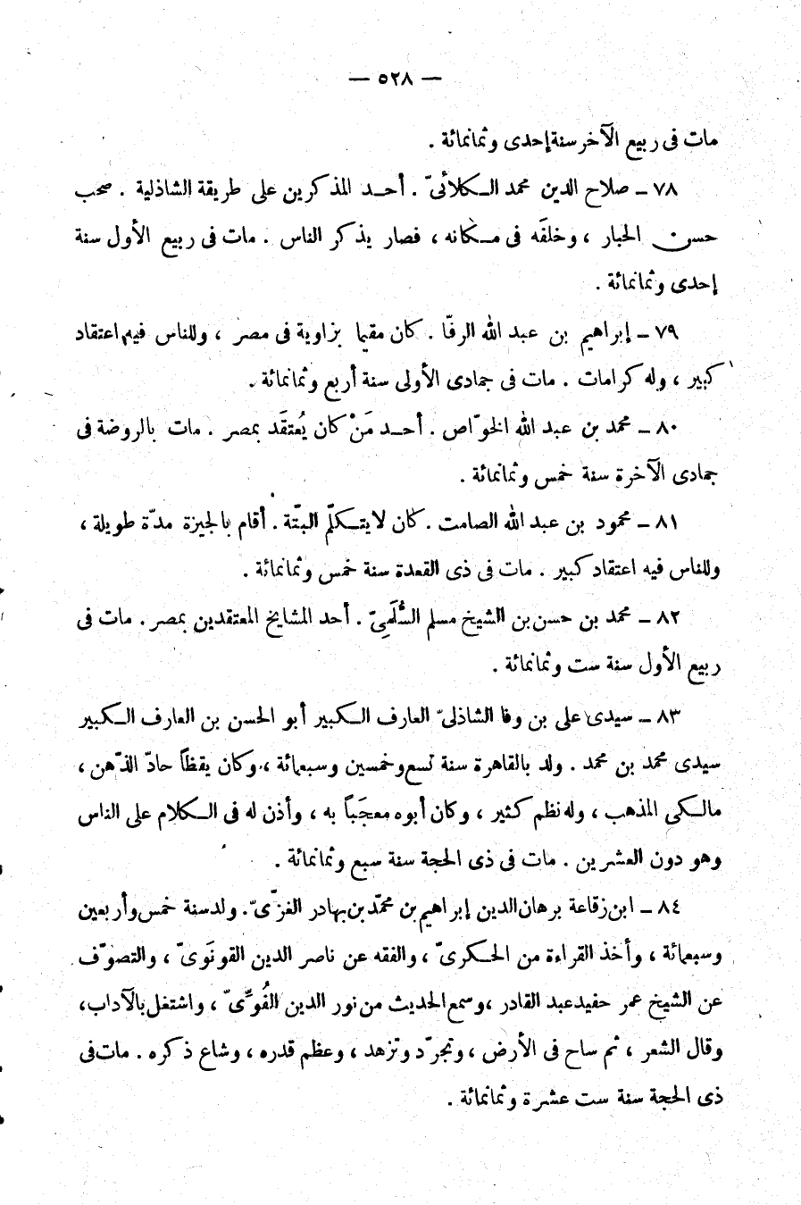 78- صلاح الدين محمد الكلائي. أحد المذكرين على طريقة الشاذلية. صحب حسن الحبار، وخلفه في مكانه، فصار يذكر الناس. مات في ربيع الأول سنة إحدى وثمانمائة.