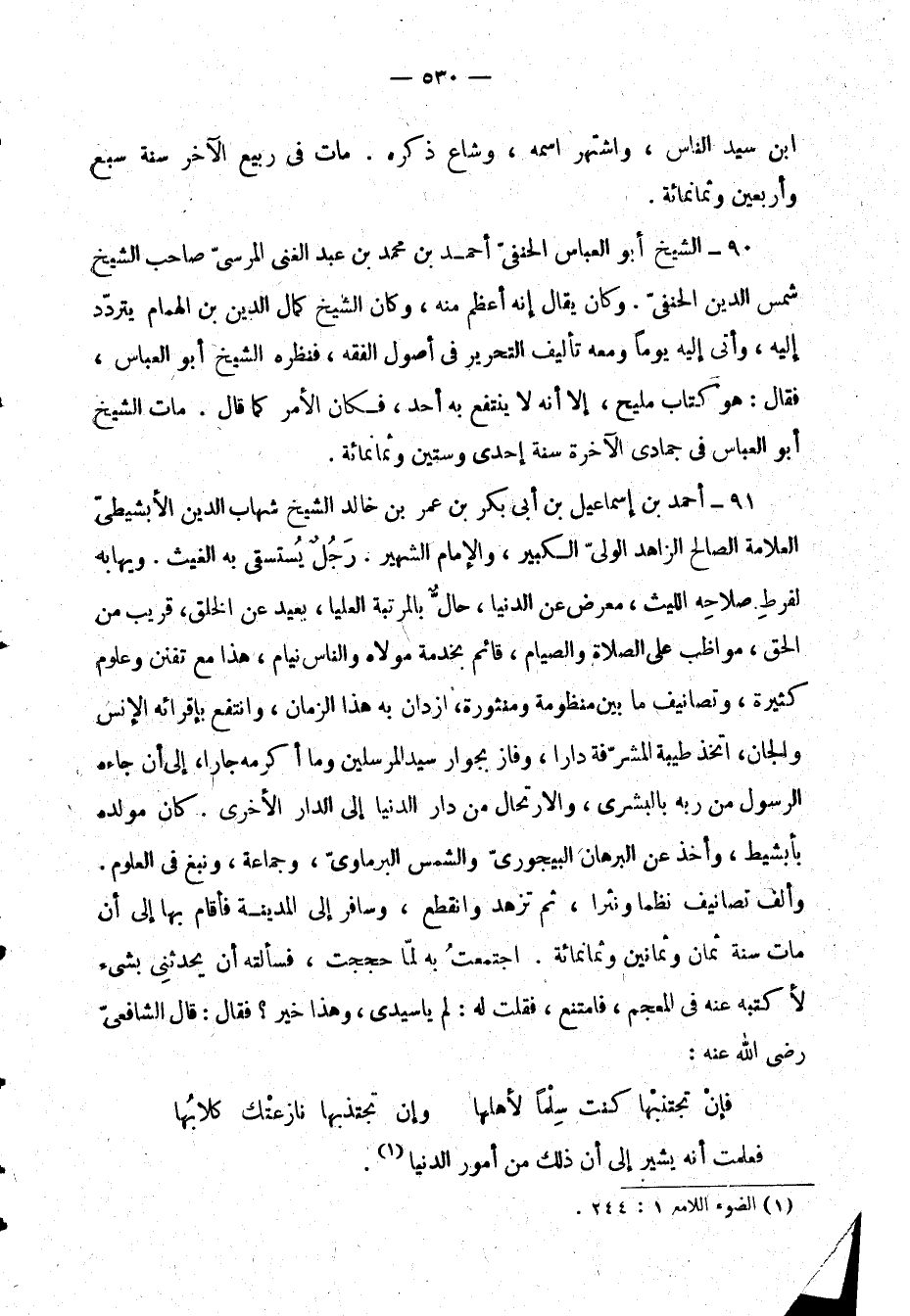 90- الشيخ أبو العباس الحنفي أحمد بن محمد عبد الغني المرسي صاحب الشيخ شمس الدين الحنفي. وكان يقال إنه أعظم منه، وكان الشيخ كمال الدين بن الهمام يتردد إليه، وأتى إليه يوما ومعه تأليف التحرير في أصول الفقه، فنظره الشيخ أبو العباس، فقال: هو كتاب مليح، إلا أنه لا ينتفع به أحد، فكان الأمر كما قال. مات الشيخ أبو العباس في جمادى الآخرة سنة إحدى وستين وثمانمائة.