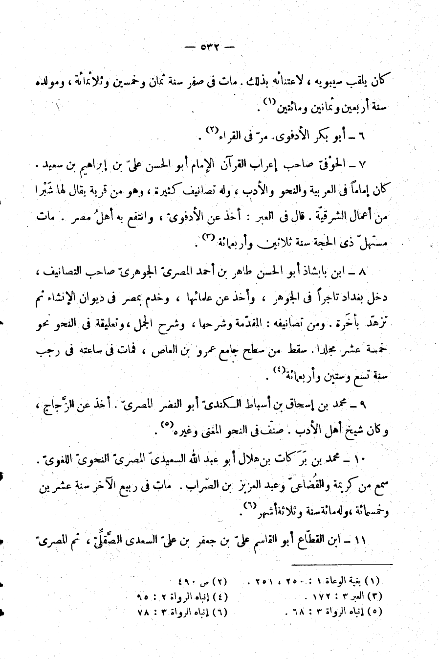 7- الحوفي صاحب إعراب القرآن الإمام أبو الحسن علي بن إبراهيم بن سعيد. كان إمامًا في العربية والنحو والأدب، وله تصانيف كثيرة، وهو من قرية يقال لها شبرا من أعمال الشرقية. قال في العبر: أخذ عن الأدفوي، وانتفع به أهل مصر. مات مستهل ذي الحجة سنة ثلاثين وأربعمائة (¬3) .