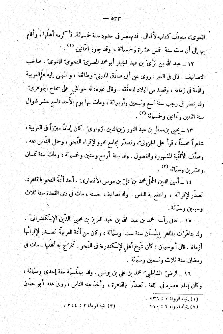 15- حافي رأسه محمد بن عبد الله بن عبد العزيز بن محيي الدين الإسكندراني. ولد بتاهرت بظاهر تلمسان سنة ست وستمائة، وكان من أئمة العربية تصدر لإقرائها أزمانًا. قال أبو حيان: كان شيخ أهل الإسكندرية في النحو. تخرج به أهلها. مات في رمضان سنة ثلاث وتسعين وستمائة.