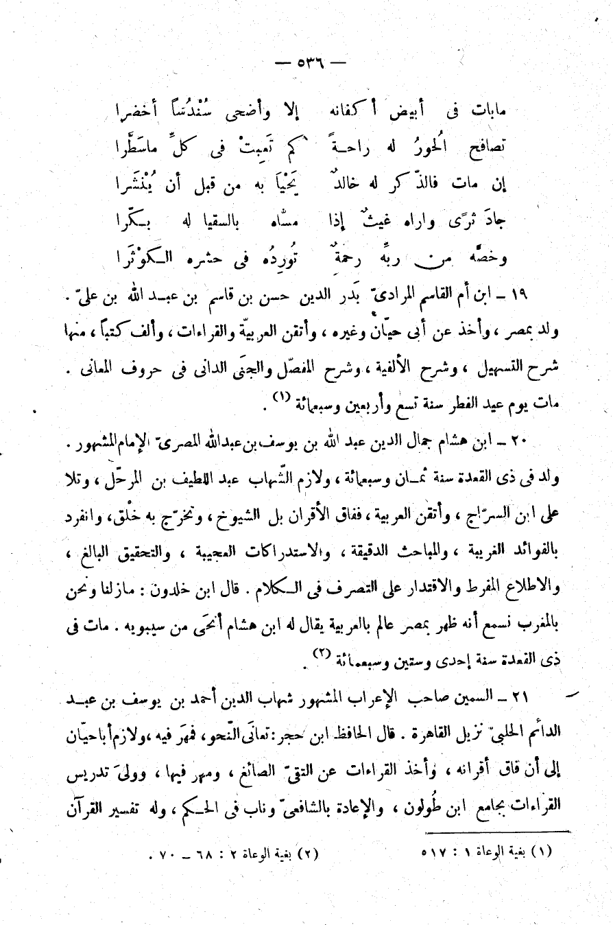 19- ابن أم القاسم المرادي بدر الدين حسن بن قاسم بن عبد الله بن علي. ولد بمصر، وأخذ عن أبي حيان وغيره، وأتقن العربية والقراءات، وألف كتبًا، منها شرح التسهيل، وشرح الألفية، وشرح المفصل والجنَى الداني في حروف المعاني. مات يوم عيد الفطر سنة تسع وأربعين وسبعمائة (¬1) .