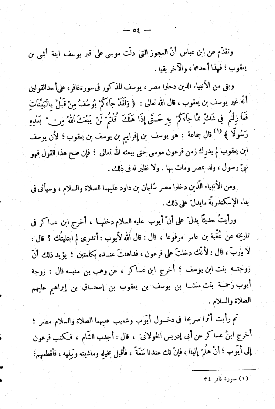 وبقي من الأنبياء الذين دخلوا مصر، يوسف المذكور في سورة غافر، على أحد القولين أنه غير يوسف بن يعقوب، قال الله تعالى: {وَلَقَدْ جَاءَكُمْ يُوسُفُ مِنْ قَبْلُ بِالْبَيِّنَاتِ فَمَا زِلْتُمْ فِي شَكٍّ مِمَّا جَاءَكُمْ بِهِ حَتَّى إِذَا هَلَكَ قُلْتُمْ لَنْ يَبْعَثَ اللَّهُ مِنْ بَعْدِهِ رَسُولًا} (¬1) قال جماعة: هو يوسف بن إفراييم بن يوسف بن يعقوب؛