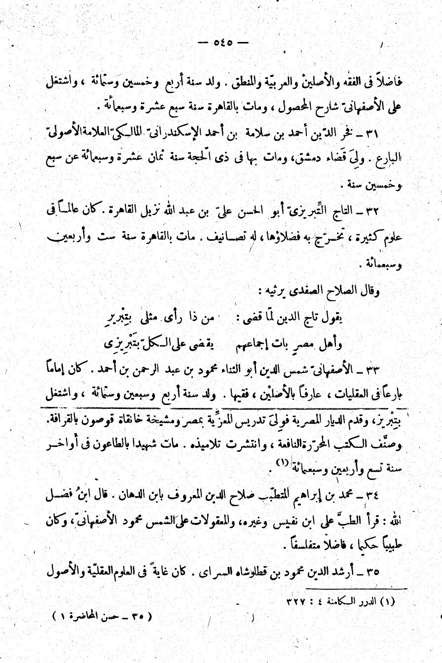 33- الأصفهاني شمس الدين أبو الثناء محمود بن عبد الرحمن بن أحمد. كان إمامًا بارعًا في العقليات، عارفًا بالأصلين، فقيهًا. ولد سنة أربع وسبعين وستمائة، واشتغل بتبريز، وقدم الديار المصرية فولي تدريس المعزية بمصر ومشيخة خانقاه قوصون بالقرافة. وصنف الكتب المحررة النافعة، وانتشرت تلاميذه. مات شهيدًا بالطاعون في أواخر سنة تسع وأربعين وسبعمائة (¬1) .