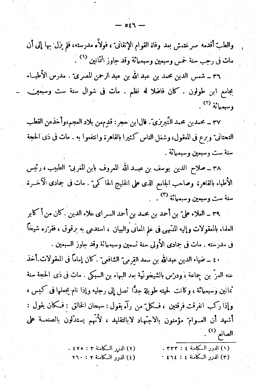 37- محمد بن محمد التبريزي. قال ابن حجر: قدم من بلاد العجم، وأخذ عن القطب التحتاني وبرع في المعقول، وشغل الناس كثيرًا بالقاهرة وانتفعوا به. مات في ذي الحجة سنة ست وسبعين وسبعمائة.