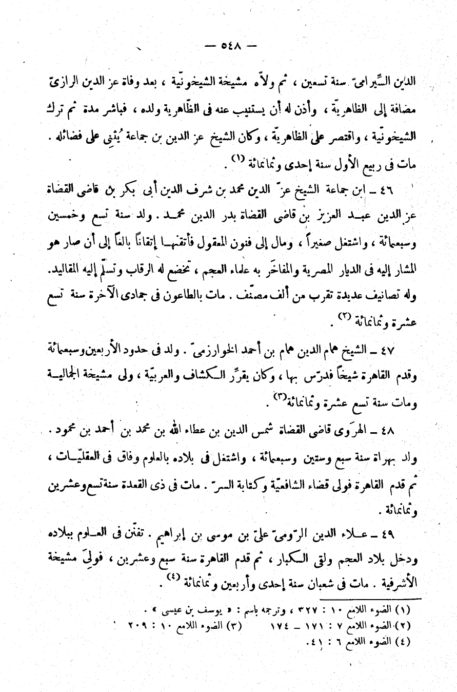 48- الهروي قاضي القضاة شمس الدين بن عطاء الله بن محمد بن أحمد بن محمود ولد بهراة سنة سبع وستين وسبعمائة، واشتغل في بلاده بالعلوم وفاق في العقليات، ثم قدم القاهرة فولي قضاء الشافعية وكتابة السر. مات في ذي القعدة سنة تسع وعشرين وثمانمائة.