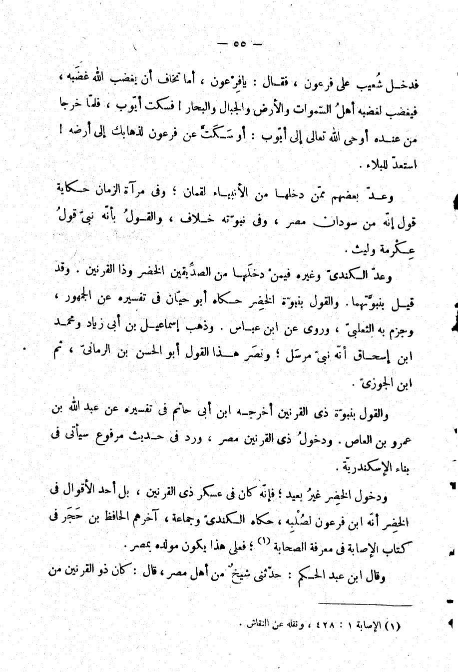 ودخول الخضر غير بعيد؛ فإنه كان في عسكر ذي القرنين، بل أحد الأقوال في الخضر أنه ابن فرعون لصلبه، حكاه الكندي وجماعة، آخرهم الحافظ ابن حجر في كتاب الإصابة في معرفة الصحابة (¬1) ؛ فعلى هذا يكون مولده بمصر.