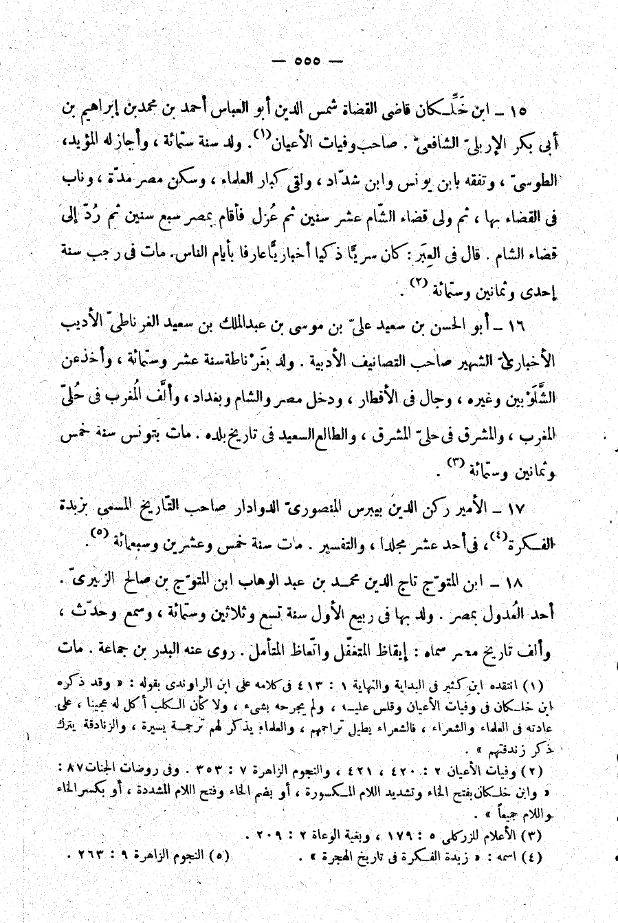 (¬2) وفيات الأعيان 2: 420، 421، والنجوم الزاهرة 7: 353. وفي روضات الجنات 87: "وابن خلكان بفتح الخاء وتشديد اللام المكسورة، أو بضم الخاء وفتح اللام المشددة، أو بكسر الخاء واللام جميعًا".