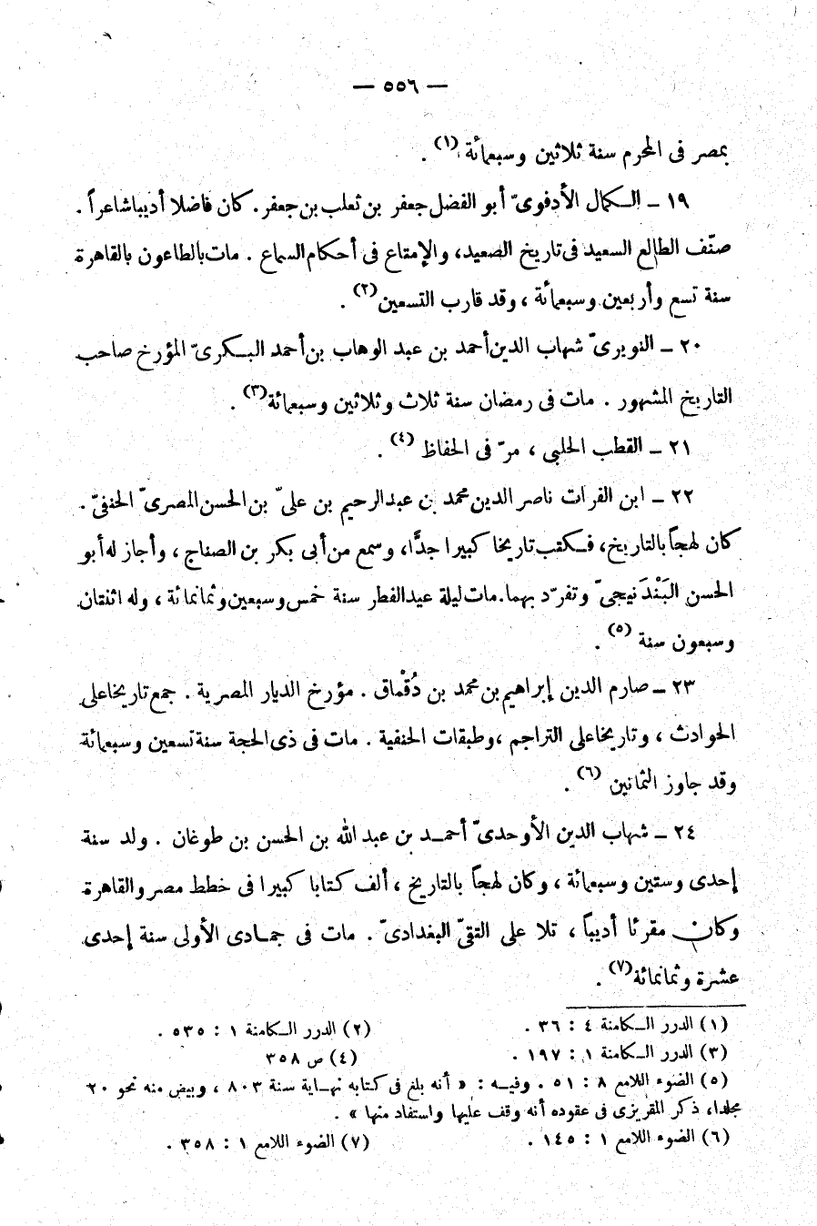 (¬5) الضوء اللامع 8: 51: "أنه بلغ في كتابه نهاية سنة 803، وبيض منه نحو 20 مجلدًا، ذكر المقريزي في عقوده أنه وقف عليها واستفاد منها".