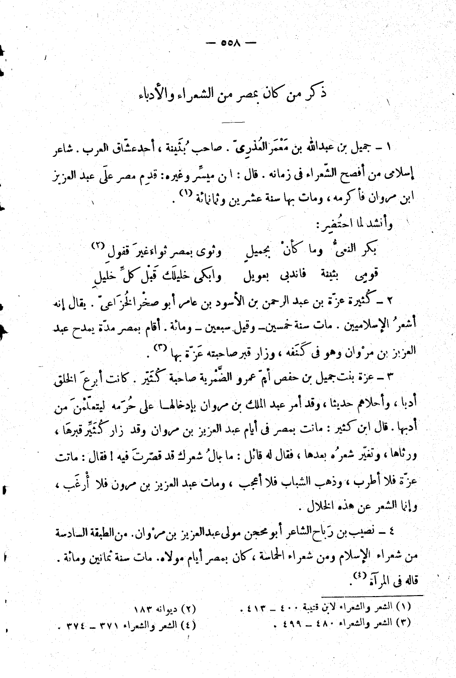 1- جميل بن عبد الله بن معمر العذري. صاحب بثينة، أحد عشاق العرب. شاعر إسلامي من أفصح الشعراء في زمانه. قال: إن ميسر وغيره: قدم مصر على عبد العزيز بن مروان فأكرمه، ومات بها سنة عشرين وثمانمائة (¬1) .