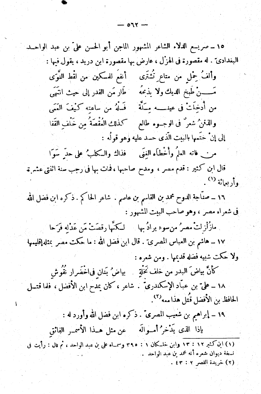(¬1) ابن كثير 12: 13، وابن خلكان 1: 395 وسماه علي بن عبد الواحد، ثم قال: رأيت في نسخة ديوان شعره أنه محمد بن عبد الواحد.