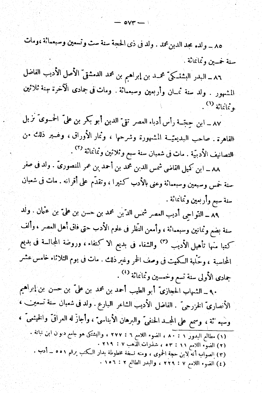 87- ابن حجة رأس أدباء العصر تقي الدين أبو بكر بن علي الحموي نزيل القاهرة. صاحب البديعية المشهورة وشرحها، وثمار الأوراق، وغير ذلك من التصانيف الأدبية. مات في شعبان سنة سبع وثلاثين وثمانمائة (¬2) .