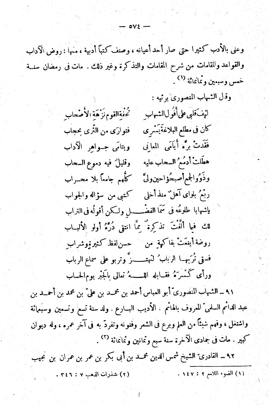 91- الشهاب المنصوري أبو العباس أحمد بن محمد بن علي بن محمد بن أحمد بن عبد الدائم السلمي المعروف بالهائم. الأديب البارع. ولد سنة تسع وتسعين وسبعمائة واشتغل، وفهم شيئًا من العلم وبرع في الشعر وفنونه وتفرد به في آخر عمره، وله ديوان كبير. مات في جمادى الآخرة سنة سبع وثمانين وثمانمائة (¬2) .
