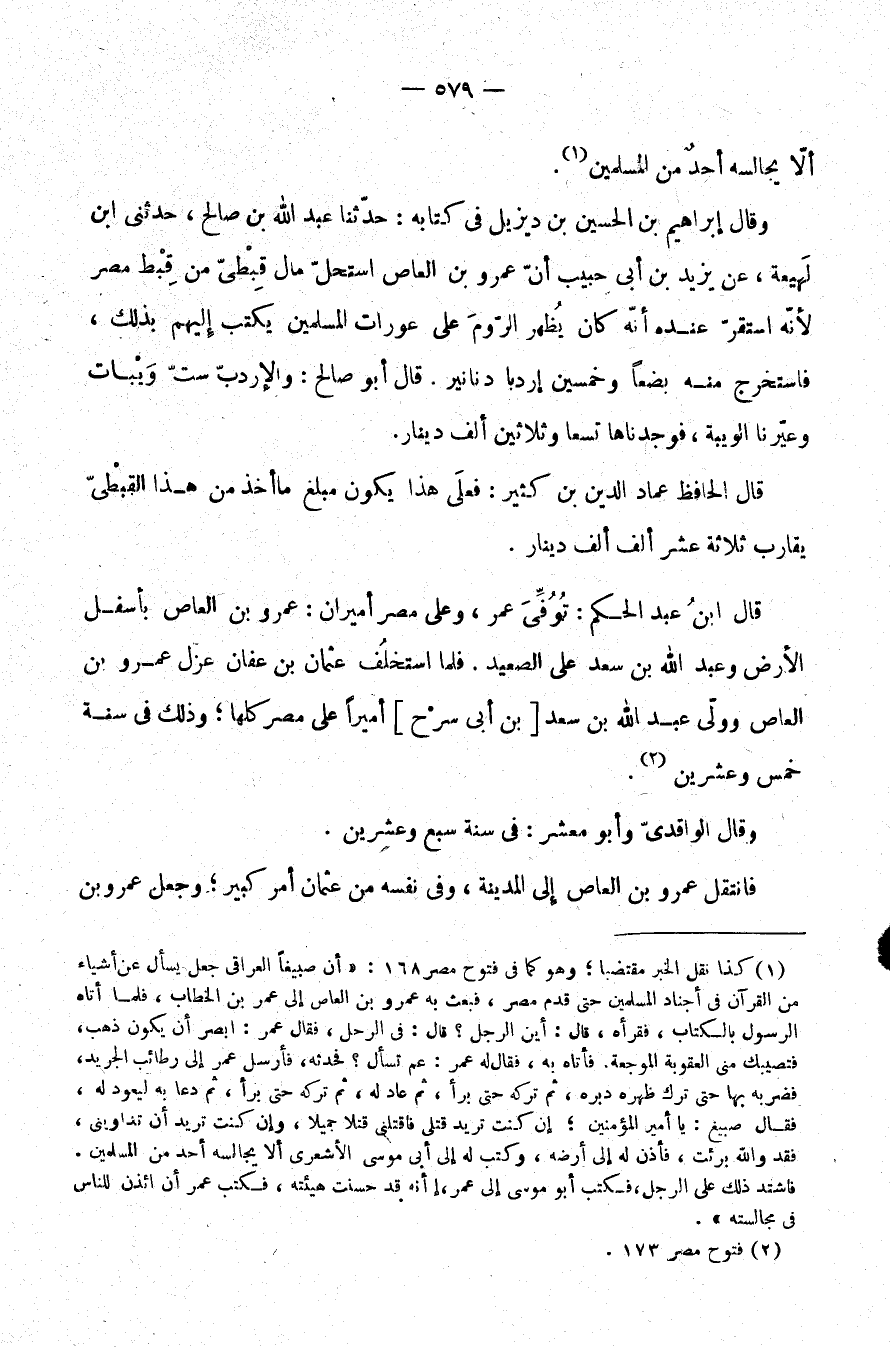 (¬1) كذا نقل الخبر مقتضبًا؛ وهو كما في فتوح مصر 168: "أن صبيغًا العراقي جعل يسأل عن أشياء من القرآن في أجناد المسلمين حتى قدم مصر، فبعث به عمرو بن العاص إلى عمر بن الخطاب، فلما أتاه الرسول بالكتاب، فقرأه، قال: أين الرجل؟ قال: في الرحل، فقال عمر: ابصر أن يكون ذهب، فتصيبك مني العقوبة الموجعة، فأت به، فقال له عمر: عم تسأل؟ فحدثه، فأرسل عمر إلى رطائب الجريد، فضربه بها حتى ترك ظهره تبره ثم تركه حتى برأ، ثم عاد له، ثم تركه حتى برأ، ثم عاد به ليعود له، فقال صبيغ: يا أمير المؤمنين؛ إن كنت تريد قتلي فاقتلني قتلًا جميلًا، وإن كنت تريد أن تداويني، فقد والله برئت، فأذن له إلى أرضه، وكتب له إلى أبي موسى الأشعري ألا يجالسه أحد من المسلمين. فاشتد ذلك على الرجل، فكتب أبو موسى إلى عمر، أنه قد حسنت هيئته، فكتب عمر أن ائذن للناس في مجالسته".