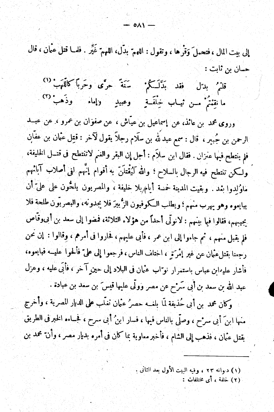 وروى محمد بن عائذ، عن إسماعيل بن عياش، عن صفوان بن عمرو، عن عبد الرحمن بن جبير، قال: سمع عبد الله بن سلام رجلا يقول لآخر: قتل عثمان بن عفان فلم ينتطح فيها عنزان. فقال ابن سلام: أجل إن البقر والغنم لا تنتطح في قتل الخليفة، ولكن تنتطح فيه الرجال بالسلاح؛ والله ليُقتلن به أقوام إنهم لفي أصلاب آبائهم ما وُلدوا بعد. وبقيت المدينة خمسة أيام بلا خليفة، والمصريون يلحون على علي أن يبايعوه وهو يهرب منهم؛ ويطلب الكوفيون الزبير فلا يجدونه، والبصريون طلحة فلا يجيبهم، فقالوا فيما بينهم: لا نولي أحدا من هؤلاء الثلاثة، فمضوا إلى سعد بن أبي وقاص فلم يقبل منهم، ثم جاءوا إلى ابن عمر، فأبى عليهم، فحاروا في أمرهم، وقالوا: إن نحن رجعنا بقتل عثمان عن غير إمرة، اختلف الناس، فرجعوا إلى علي فألحوا عليه فبايعوه، فأشار عليه ابن عباس باستمرار نواب عثمان في البلاد إلى حين آخر، فأبى عليه، وعزل عبد الله بن سعد بن أبي سرح عن مصر وولى عليها قيس بن سعد بن عبادة.